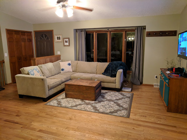 Meet our new (hand-me-down) couch! Tom was gracious enough to pass this on to us, and since our previous couch and loveseat had holes in them, we were thrilled! It has a pull-out bed, which should be nice on those rare times we need an extra place for someone to sleep and it is so much more comfortable than our last one. The best part is that we don't have to spend a whole pile on money on a new piece of furniture that our kids are going to wreck and spill on!