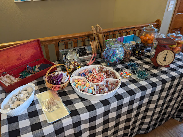 One of the best parts of the party was the general store that we put together.  Each kid got several pennies and got to "purchase" items that would have been found in a pioneer era general store...fabric, buttons, simple candies, ribbon, marbles, tea, candles, soap, and more.  It was so fun and it took each kid a very long time to carefully choose their items.  It was such a fun experience!